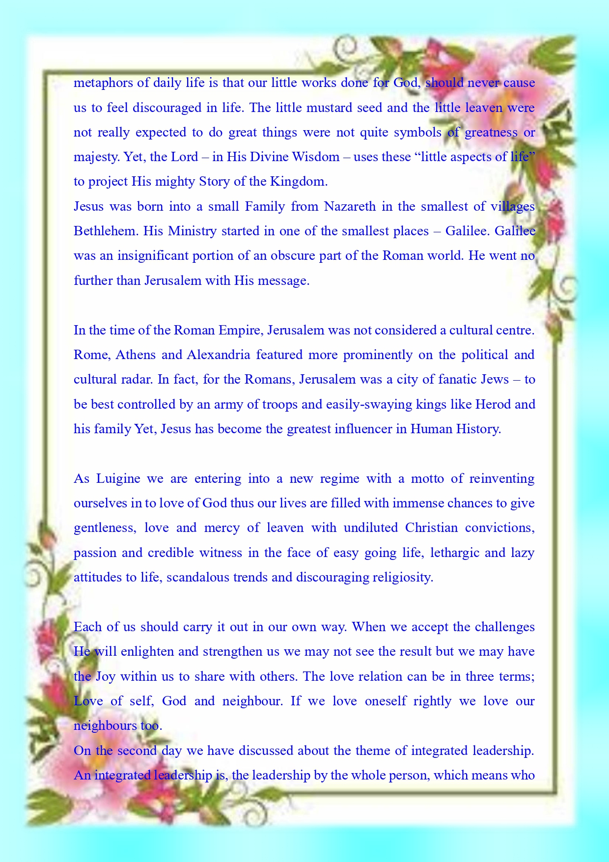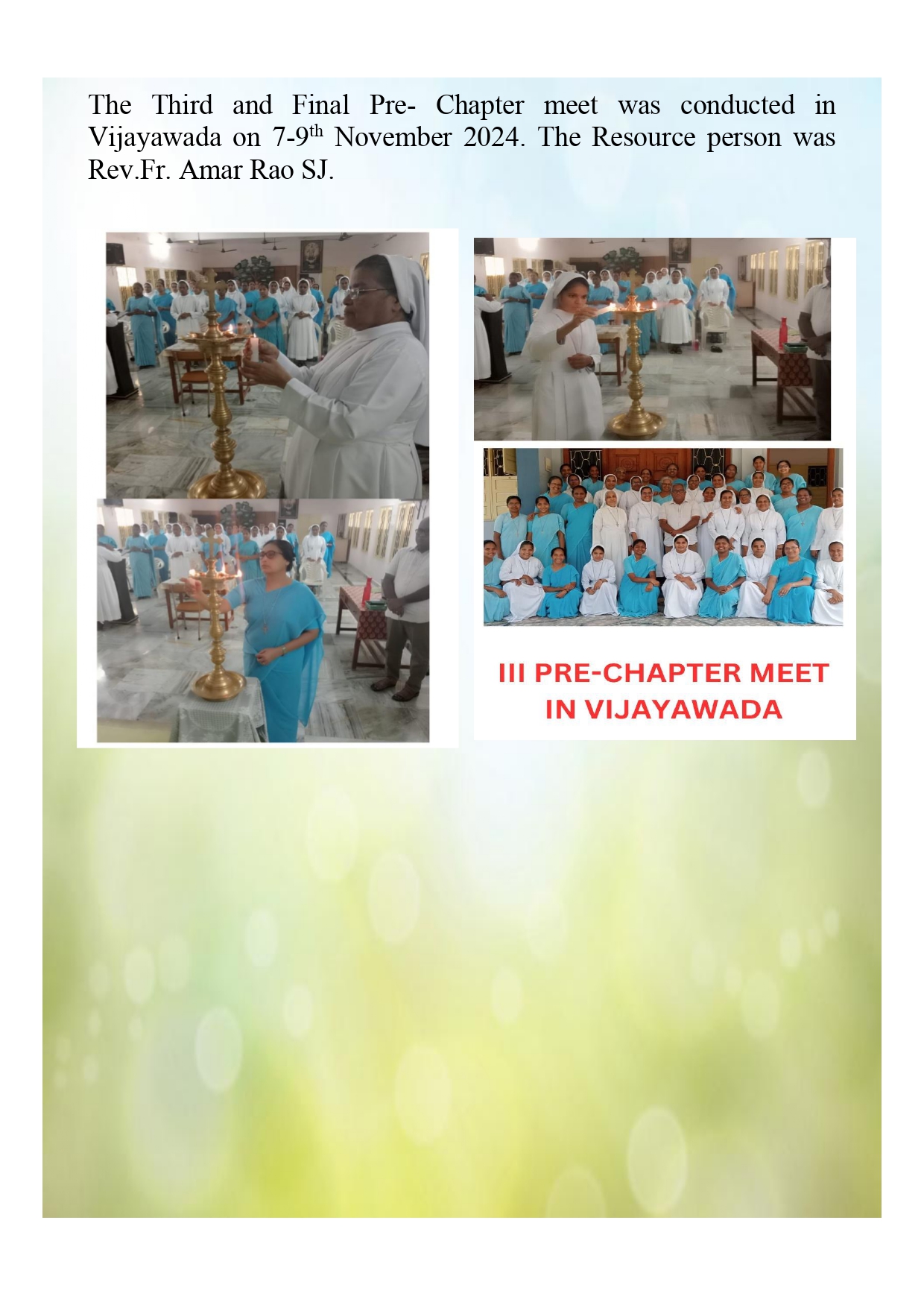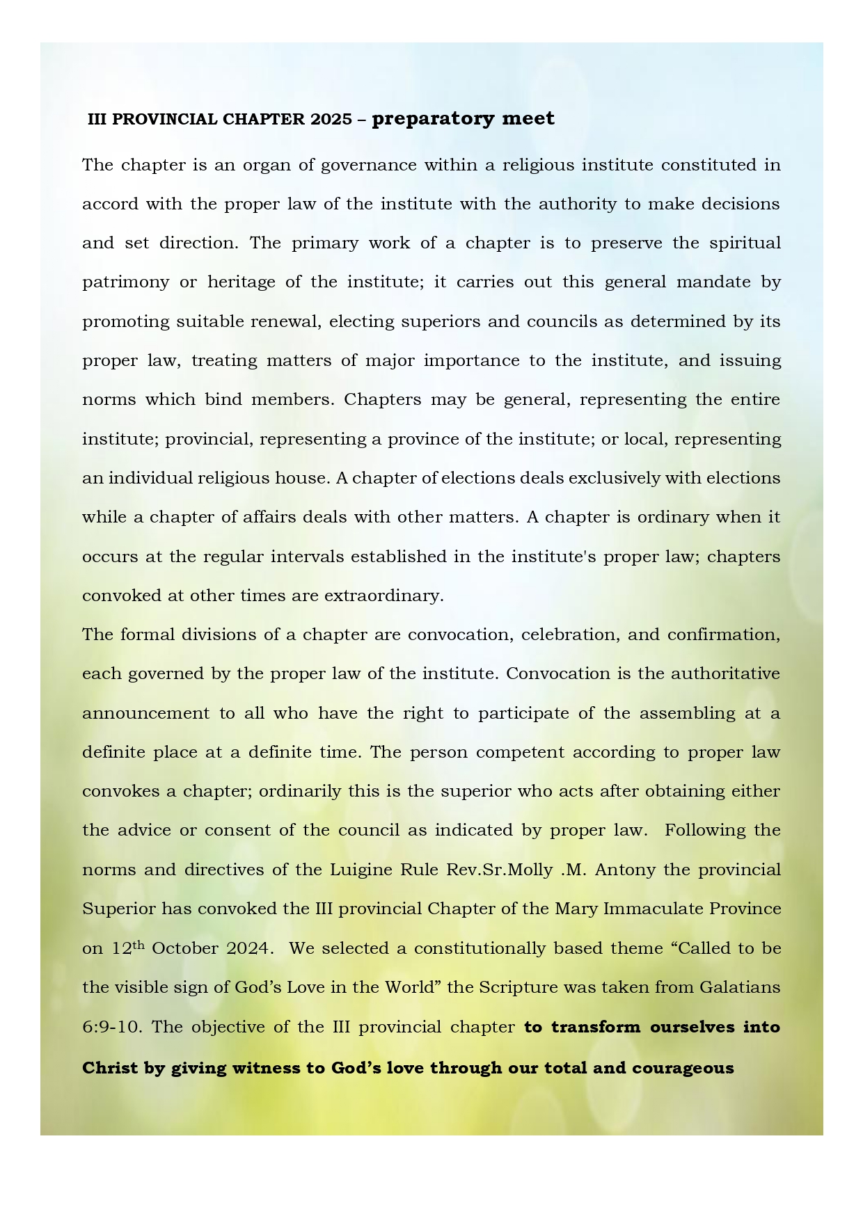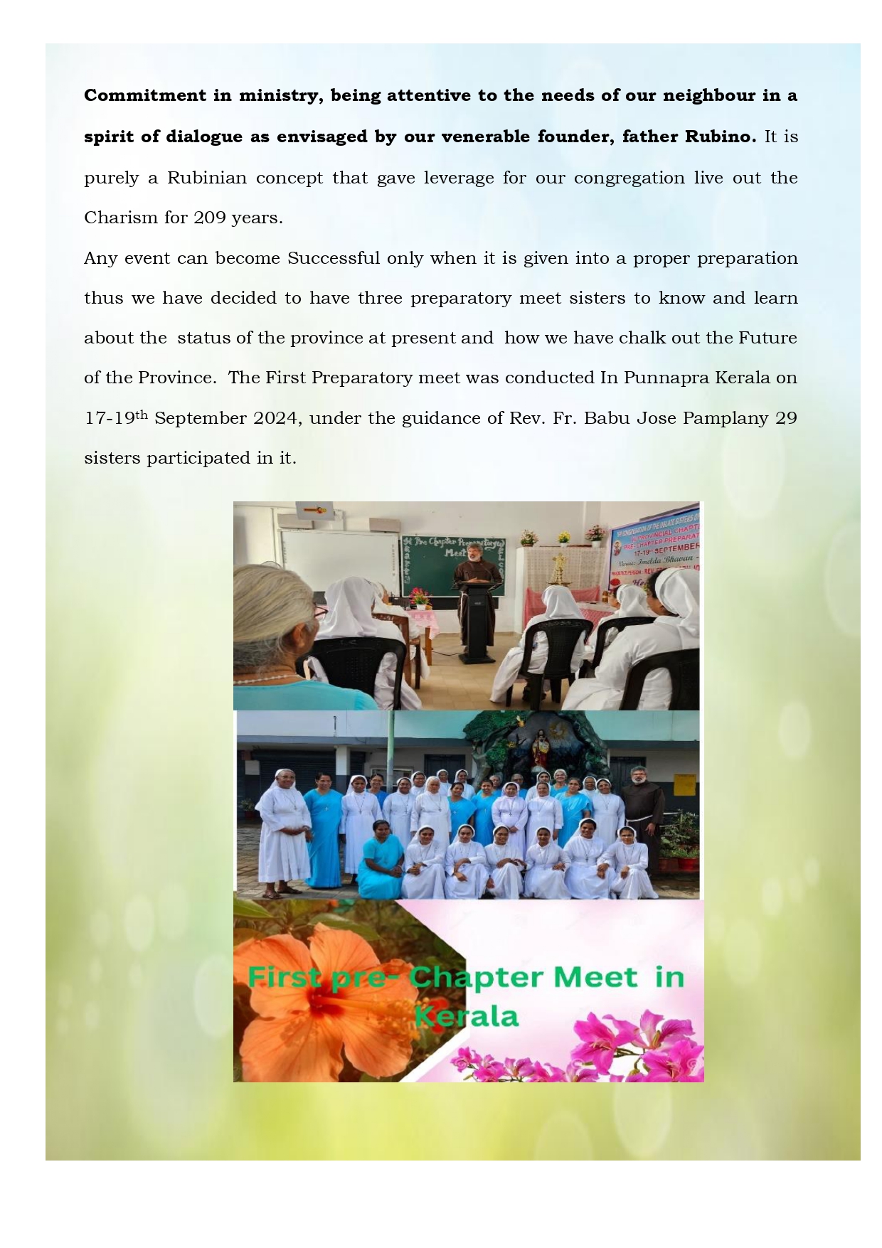 TO TRANSFORM OURSELVES INTO CHRIST BY GIVING WITNESS TO GOD’S LOVE THROUGH OUR TOTAL AND COURAGEOUS COMMITMENT IN MINISTRY, BEING ATTENTIVE TO THE NEEDS OF OUR NEIGHBOUR IN A SPIRIT OF DIALOGUE AS ENVISAGED BY OUR VENERABLE FOUNDER, FATHER RUBINO.